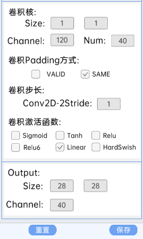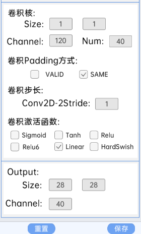 本bneck结构第四层Conv2D卷积核的宽、高、通道、个数是(1 x 1 x 120 x 40),padding方式为SAME,步长为1,经过batchNorm进行归一化,经计算可知,输出特征矩阵为(28 x 28 x 40)。