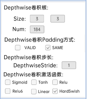 本bneck结构第二层DwiseConv2D卷积核的宽、高、个数是(3 x 3 x 184),padding方式为SAME,步长为1,经过batchNorm进行归一化,以及h-swish[x]激活函数,经计算可知,输出特征矩阵为(14 x 14 x 184)。