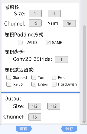本bneck结构第二层Conv2D卷积核的宽、高、通道、个数是(1 x 1 x 16 x 16),padding方式为SAME,步长为1,经过batchNorm进行归一化,经计算可知,输出特征矩阵为(112 x 112 x 16)。