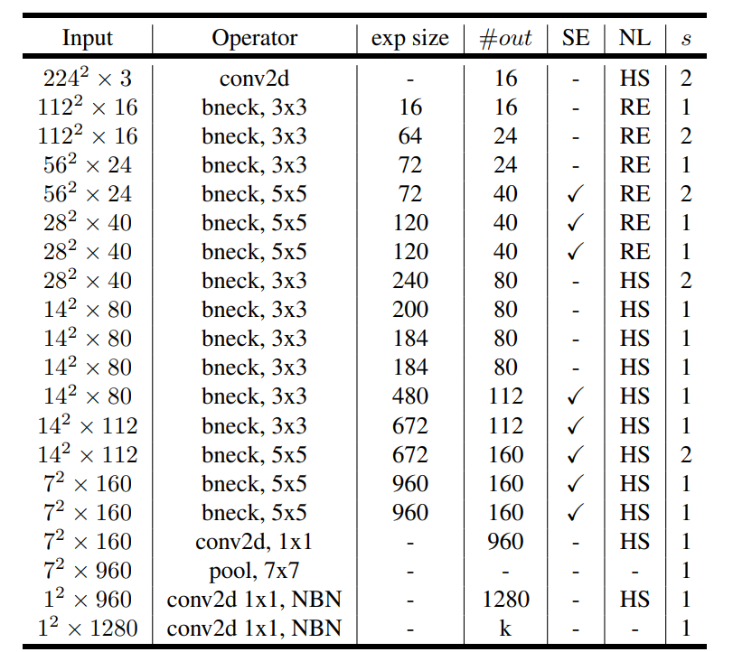 - SE代表这一层bneck是否使用注意力机制,对号代表使用;