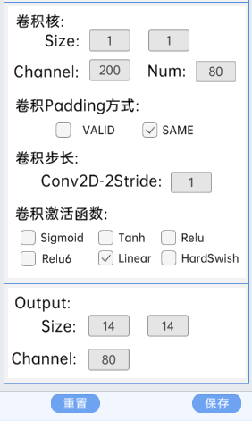 本bneck结构第三层Conv2D卷积核的宽、高、通道、个数是(1 x 1 x 200 x 80),padding方式为SAME,步长为1,经过batchNorm进行归一化,经计算可知,输出特征矩阵为(14 x 14 x 80)。