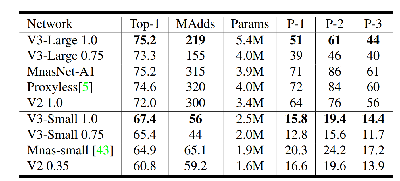 MobileNetV3提出了large和small两个版本(区别在于网络结构不同),paper中讲在MobileNetV3 Large在ImageNet分类任务上,较MobileNetV2,TOP1准确率提高了大约3.2%,时间减少了20%。与具有同等延迟的MobileNetV2模型相比,MobileNetV3 Small的准确率高6.6%。