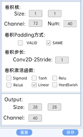 本bneck结构第四层Conv2D卷积核的宽、高、通道、个数是(1 x 1 x 72 x 40),padding方式为SAME,步长为1,经过batchNorm进行归一化,经计算可知,输出特征矩阵为(28 x 28 x 40)。