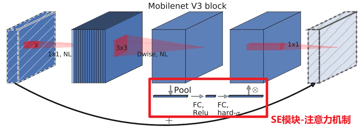 在MobileNetV3中的某些层中(注意不是全部),在进行最后一个1x1卷积之前,要进行一个SE模块注意力机制,MobileNetV3的倒残差如下图所示: