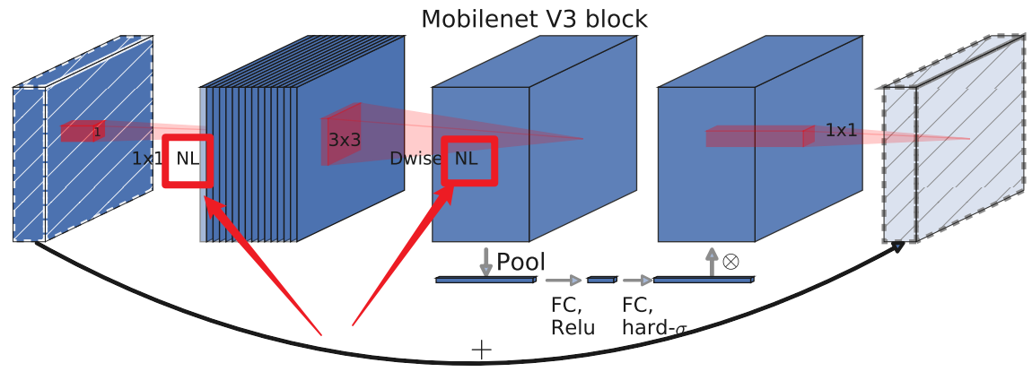 在新的Block结构中,更新了激活函数,在下图中的红框内可以看到,激活函数用了NL进行表示,NL指的是非线性激活函数,在不同的层中,使用了不同的激活函数,所以只是用了NL进行表示具体哪一层用了什么激活函数,会在网络的结构中指出。