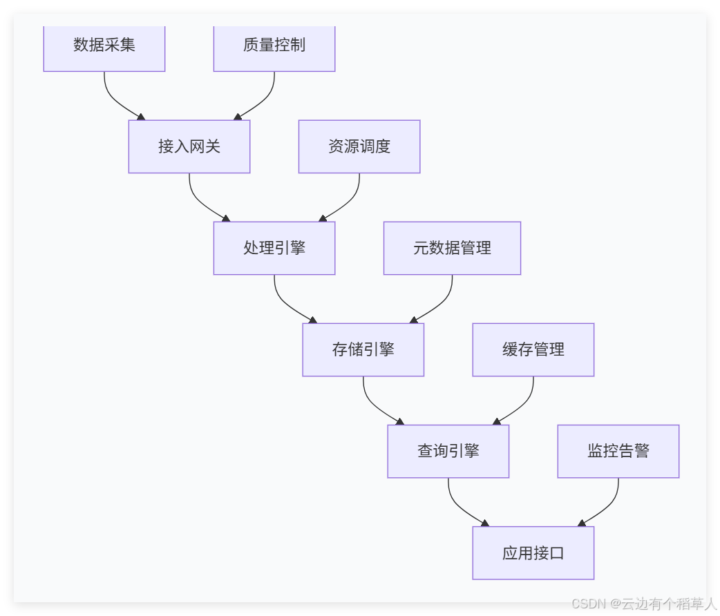 这个架构的每个环节都经过精心设计:数据从接入网关进入,就像原材料进入工厂的质检环节,确保数据的完整性和准确性。接着,处理引擎对数据进行清洗、转换和增强,就像生产线上的加工工序。存储引擎则是整个工厂的智能仓库,不仅要安全存储,还要优化布局以便快速存取。查询引擎相当于订单处理中心,快速响应各种数据查询需求。而元数据管理、资源调度等支撑系统,就如同工厂的管理体系,确保各个环节协调运作。