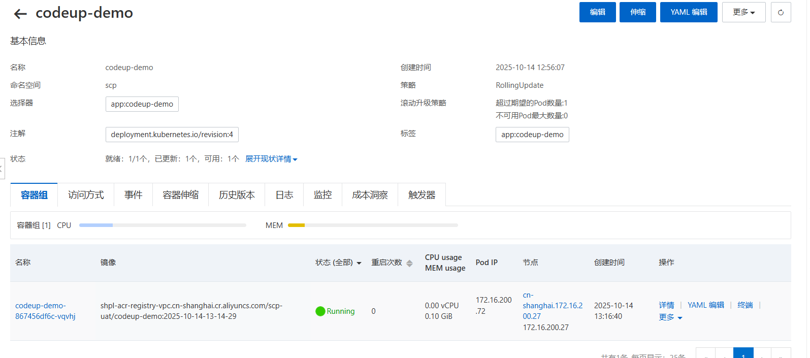 apiVersion: v1 kind: Service metadata:name: codeup-demonamespace: scplabels:app: codeup-demo spec:type: ClusterIP #NodePortports:- name: 8080-8080-tcpport: 8080protocol: TCPtargetPort: 8080#nodePort: 31080 #service对外开放端口selector:app: codeup-demo --- apiVersion: apps/v1 kind: Deployment #对象类型 metadata:name: codeup-demo #名称namespace: scplabels:app: codeup-demo #标注 spec:replicas: 1 #运行容器的副本数,修改这里可以快速修改分布式节点数量progressDeadlineSeconds: 600 #在Deployment 在进度卡住6分钟后报告minReadySeconds: 10 #Pod被认为是可用状态的最小秒数。默认是0strategy:rollingUpdate:maxSurge: 1 #升级过程中激增Pod的最大数量maxUnavailable: 0 #升级过程中不可用Pod的最大数量type: RollingUpdateselector:matchLabels:app: codeup-demotemplate:metadata:labels:app: codeup-demospec:containers: #docker容器的配置- name: codeup-demo#image: shpl-acr-registry.cn-shanghai.cr.aliyuncs.com/scp-uat/codeup-demo:$IMG_TAG # pull镜像的地址 ip:prot/dir/images:tagimage: ${image}imagePullPolicy: Always #pull镜像时机,ports:- containerPort: 8080 #容器对外开放端口,需与springboot配置文件一致env:- name: aliyun_logs_catalinavalue: stdoutvolumeMounts:- name: time-configmountPath: /etc/localtimereadOnly: true#- name: volume-logs# mountPath: /logs# subPath: logsresources:limits:cpu: 50mmemory: 1Girequests:cpu: 10mmemory: 200Mi#从私有仓库拉取镜像凭证imagePullSecrets:- name: scp-acr-temp #scp-acr-secretnodeSelector:env: scp # 节点标签的键值对volumes:- name: time-confighostPath:path: /usr/share/zoneinfo/Asia/Shanghai # - name: volume-logs # persistentVolumeClaim: # claimName: rz-dt-nas-volume-claim-real