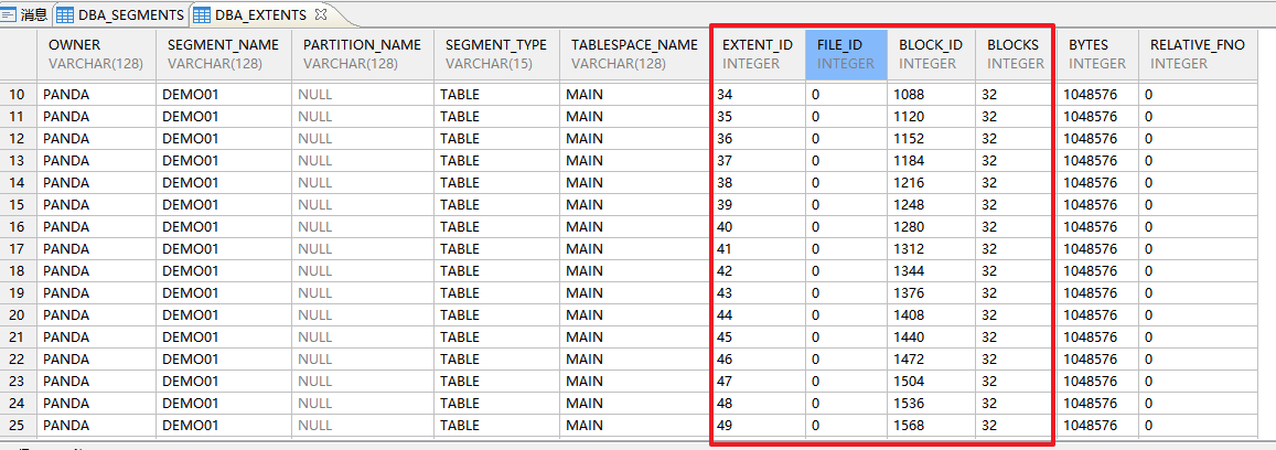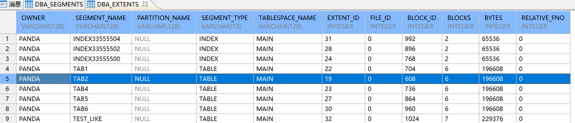 select * from DBA_EXTENTS where owner='PANDA' ;
