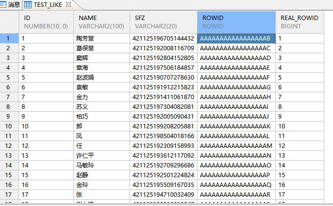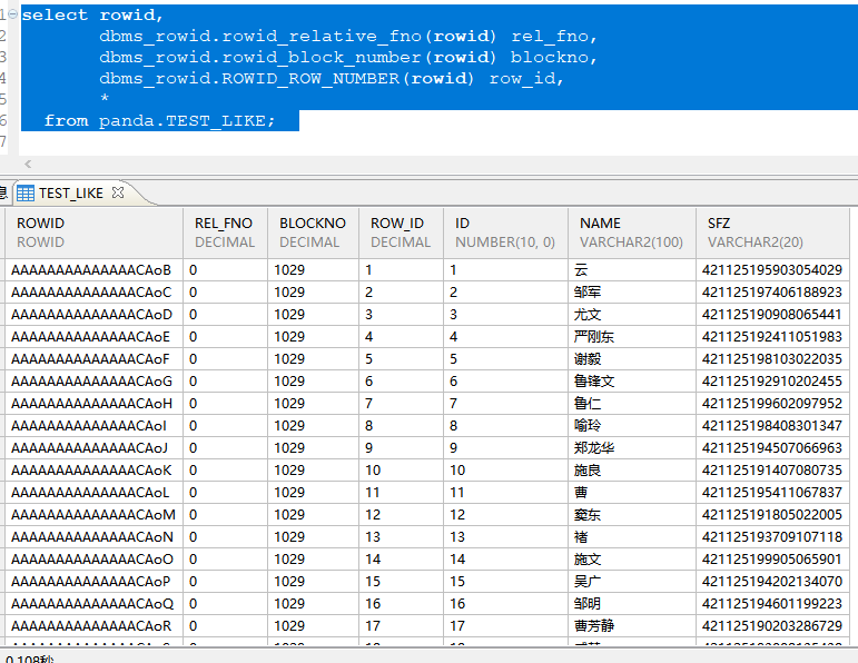 select rowid,PHYROWID,((PHYROWID >> 48) & 0xFF) AS FILE_NO,((PHYROWID >> 16) & 0xFFFFFFFF) AS PAGE_NO,* from panda.TEST_LIKE;