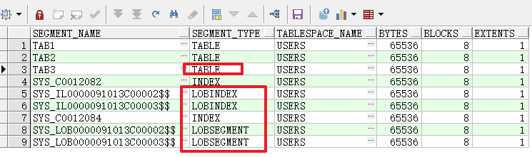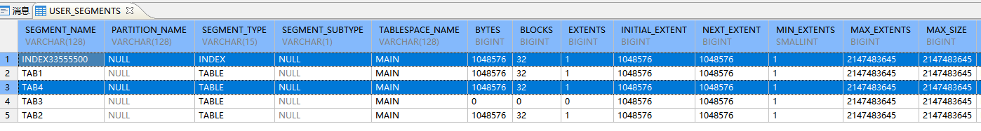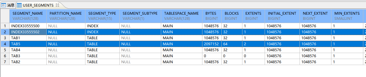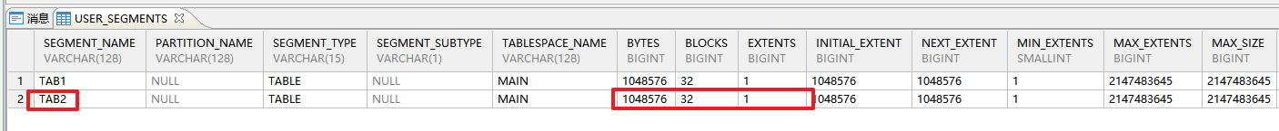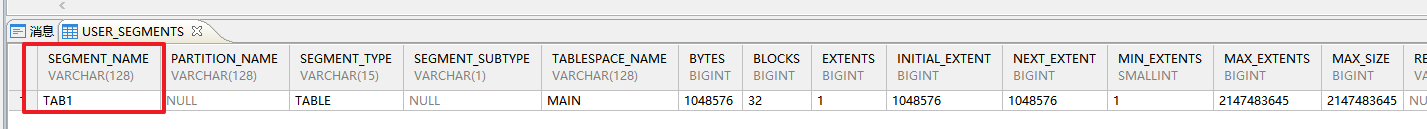会有一个表段和一个索引段,并且表段初始分配了两个簇(2个extens)这个和Oracle是不一样的,相同ddl语句Oracle创建了一个表段、一 个索引段、2 个 lobindex,2 个 lobsegment,也就是Oracle会为每个大字段创建一个lob段和lob索引段。