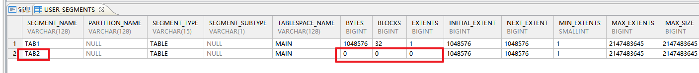 DEFERRED_SEGMENT_CREATION 1 0 1 1 SYS Whether enable default defered segment creationused time: 7.797(ms). Execute id is 12469.create table tab2(id number);select * from user_segments;