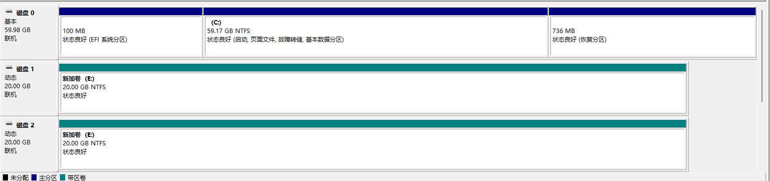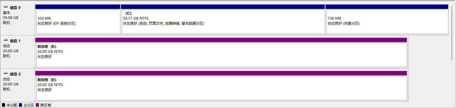 创建完成之后我们发现,两块磁盘的空间被划入同一个区。