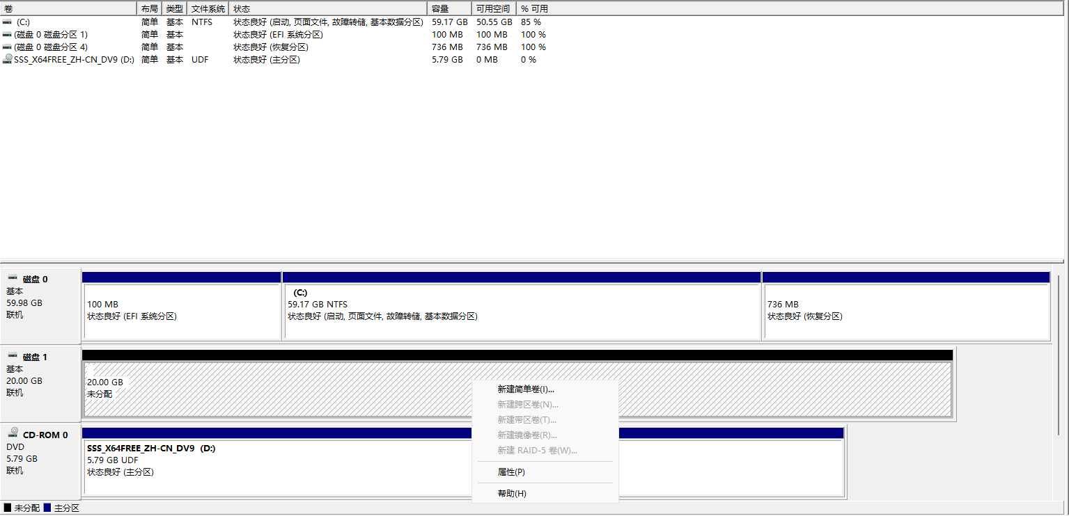 初始化过后,我们直接对未分配空间鼠标右击,选择新建简单卷。