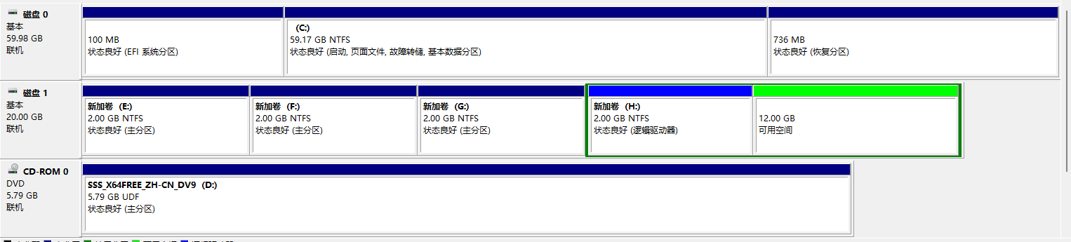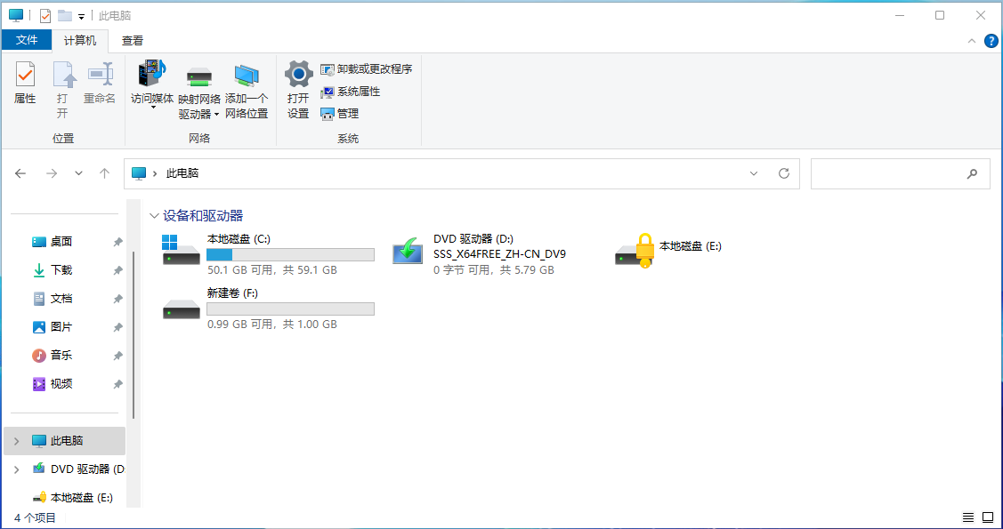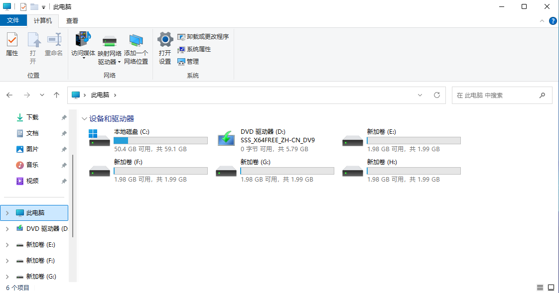 我们重新回到此电脑,发现我们在新磁盘上划分的区都成为了我们使用的所谓“E、F、G、H盘”。也就是说一块新添加磁盘需要先联机、初始化、分区才能够正常使用。
