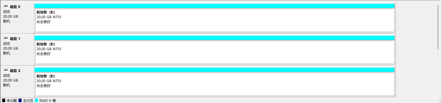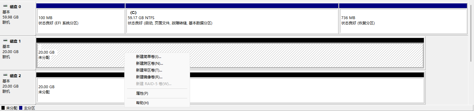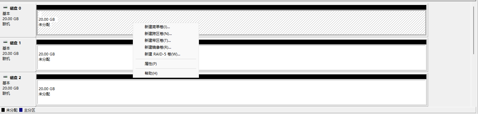 对磁盘2进行联机、初始化过后右击新建RAID-5卷。