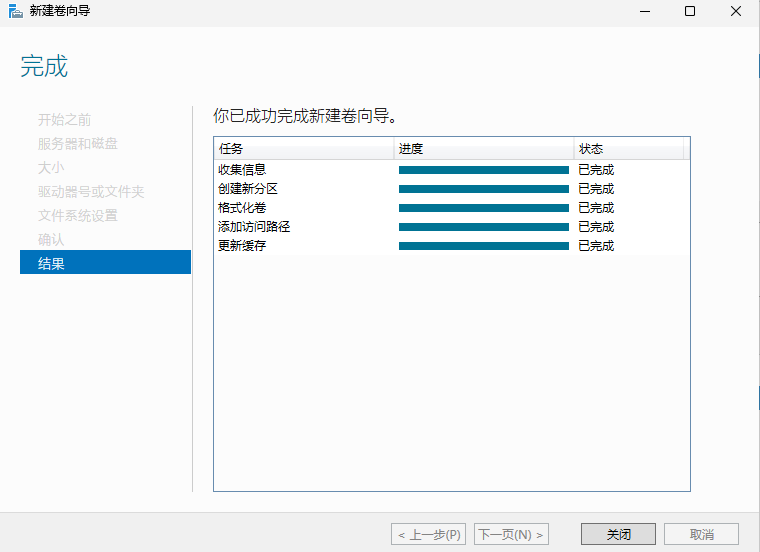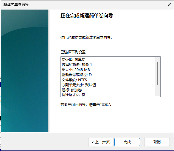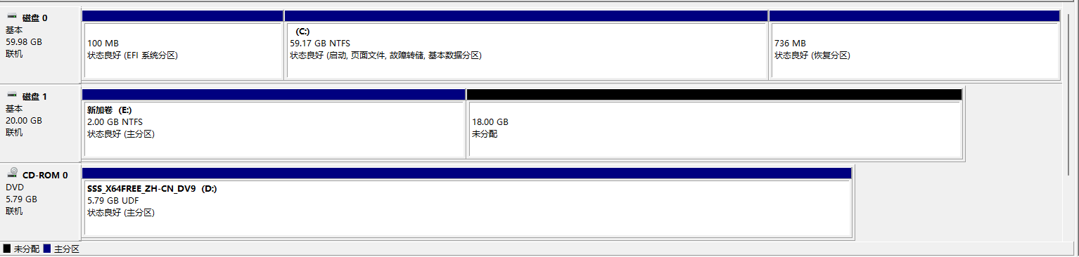 分区完成之后我们会发现被划分的部分变成了蓝色。重复以上操作,将磁盘分为多个部分吧。