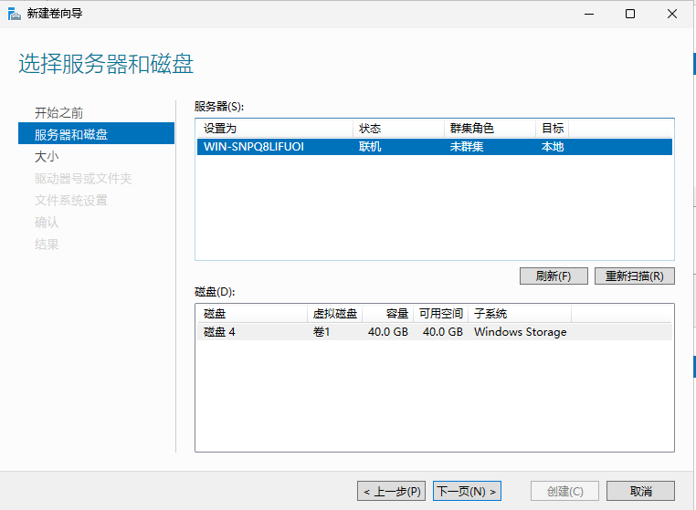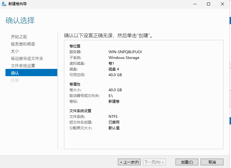 完成如上操作之后你会发现存储池下方新添加了卷信息。其大小刚好为我们划分的40GB,分区完后右击它选择新建卷。