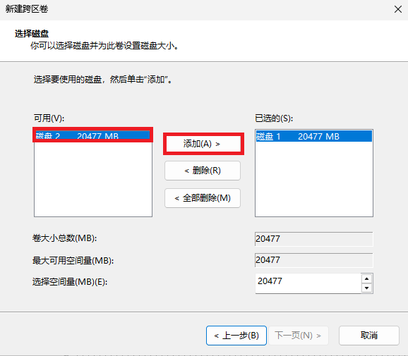 选中可用中的磁盘2,添加到已选。然后下一步。
