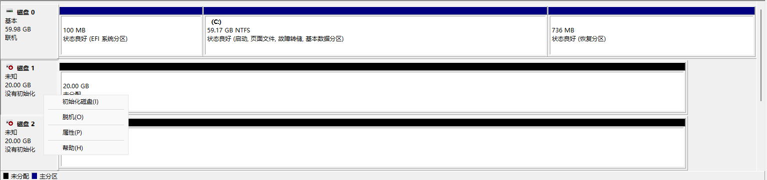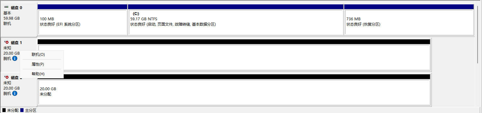 打开虚拟机,打开计算机管理器的磁盘管理界面,右击磁盘选择联机,并将磁盘格式化为MBR格式。