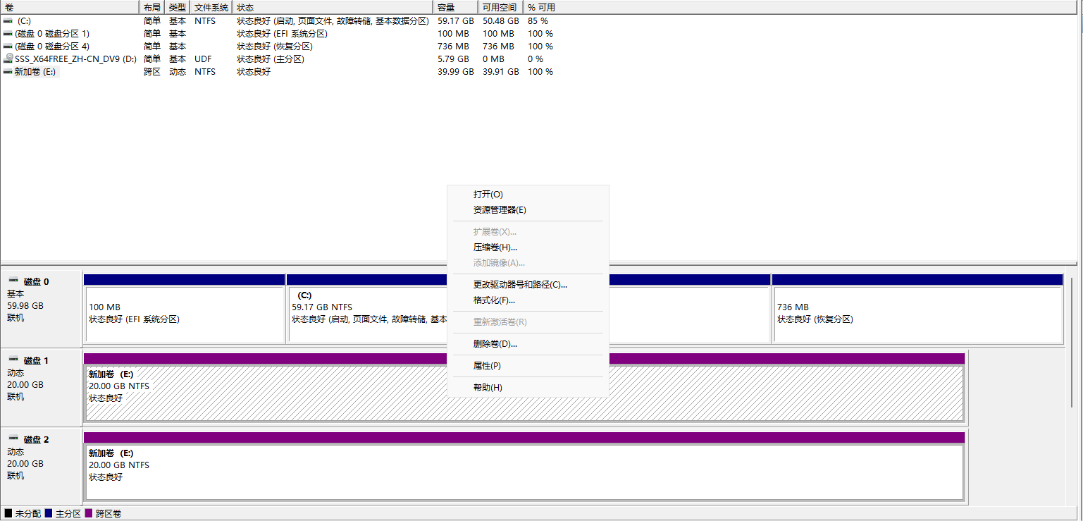 首先右击新加卷(E:)选择删除卷。然后新建带区卷,由于操作都是类似的,这里给出结果展示。