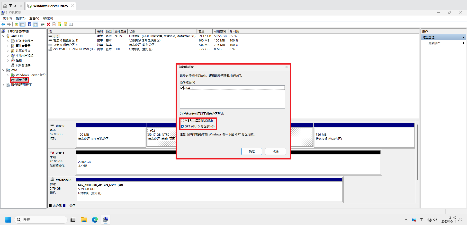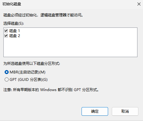 按下Win+R,然后再按G打开计算机管理器,选择磁盘管理。进入磁盘管理界面之后我们发现自动弹出了“磁盘初始化”弹窗,并且其中有两个选项,分别是MBR、GPT两种格式。那这两种格式有什么区别呢?跟随着操作来认识吧,这里我们先选择MBR格式。