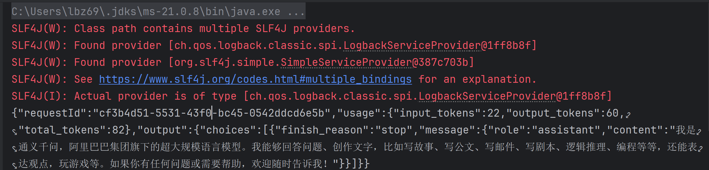 public class HttpAiInvoke {private static final String API_URL = "https://dashscope.aliyuncs.com/api/v1/services/aigc/text-generation/generation";private static final String API_KEY = TestApiKey.API_KEY;/*** 使用hutool发送HTTP请求调用阿里云DashScope服务* @param systemPrompt 系统提示词* @param userPrompt 用户提示词* @param model 模型名称,默认为qwen-plus* @return 响应结果字符串*/public static String callWithHutool(String systemPrompt, String userPrompt, String model) {// 构建请求体JSONMap<String, Object> requestBody = new HashMap<>();requestBody.put("model", model);// 构建input字段Map<String, Object> input = new HashMap<>();JSONArray messages = new JSONArray();// 添加系统消息JSONObject systemMessage = new JSONObject();systemMessage.put("role", "system");systemMessage.put("content", systemPrompt);messages.add(systemMessage);// 添加用户消息JSONObject userMessage = new JSONObject();userMessage.put("role", "user");userMessage.put("content", userPrompt);messages.add(userMessage);input.put("messages", messages);requestBody.put("input", input);// 构建parameters字段Map<String, Object> parameters = new HashMap<>();parameters.put("result_format", "message");requestBody.put("parameters", parameters);// 发送POST请求HttpResponse response = HttpRequest.post(API_URL).header("Authorization", "Bearer " + API_KEY).header("Content-Type", "application/json").body(JSONUtil.toJsonStr(requestBody)).execute();// 返回响应结果return response.body();}/*** 重载方法,使用默认模型qwen-plus*/public static String callWithHutool(String systemPrompt, String userPrompt) {return callWithHutool(systemPrompt, userPrompt, "qwen-plus");}/*** 主方法,用于测试*/public static void main(String[] args) {try {String result = callWithHutool("You are a helpful assistant.", "你是谁?");System.out.println("Response: " + result);} catch (Exception e) {System.err.println("Error occurred: " + e.getMessage());e.printStackTrace();}}