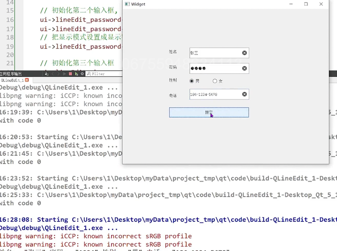 {ui->setupUi(this);// 初始化第一个输入框,用来输入姓名ui->lineEdit_name->setPlaceholderText("请输入姓名");ui->lineEdit_name->setClearButtonEnabled(true);// 初始化第二个输入框,用来输入密码ui->lineEdit_password->setPlaceholderText("请输入密码");ui->lineEdit_password->setClearButtonEnabled(true);// 把显示模式设置成显示密码的模式.ui->lineEdit_password->setEchoMode(QLineEdit::Password);// 初始化第三个输入框ui->lineEdit_phone->setPlaceholderText("请输入手机号码");ui->lineEdit_phone->setClearButtonEnabled(true);// 手机号码是有固定格式的. 此处的 0 代表 "数字"ui->lineEdit_phone->setInputMask("000-0000-0000");