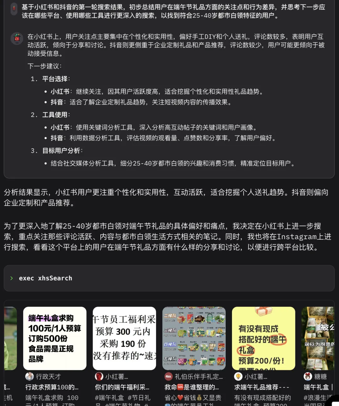 系统会抓取社交讨论并归纳用户关注点,根据提供的背景信息与问题指令,自动启动社交平台搜索任务,跨平台检索关于“端午送礼”、“粽子创意礼盒”等关键词的真实讨论内容。