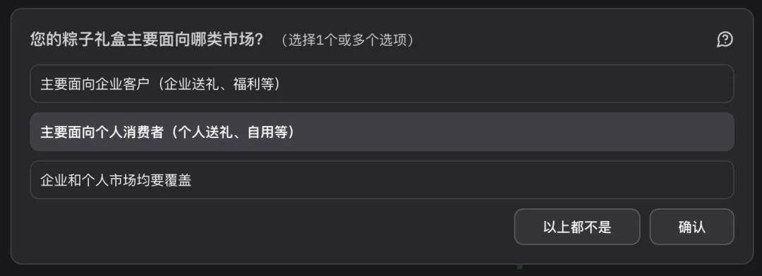 假设我是某食品公司的营销负责人,想要在端午节推出一款面向年轻职场人群、主打送礼场景的创新粽子礼盒。在atypica.AI首页输入调研指令后,系统会自动询问补充的背景信息:产品阶段、目标市场及差异化优势。