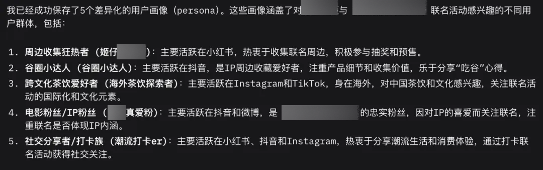 系统开始自动抓取相关社交平台内容,根据真实评论与互动讨论生成五类典型用户画像。这次调研目标为追踪活动热度,故也列出了各种类型的用户更活跃于哪一个社交平台。