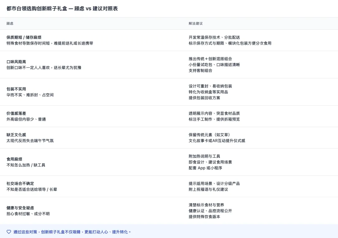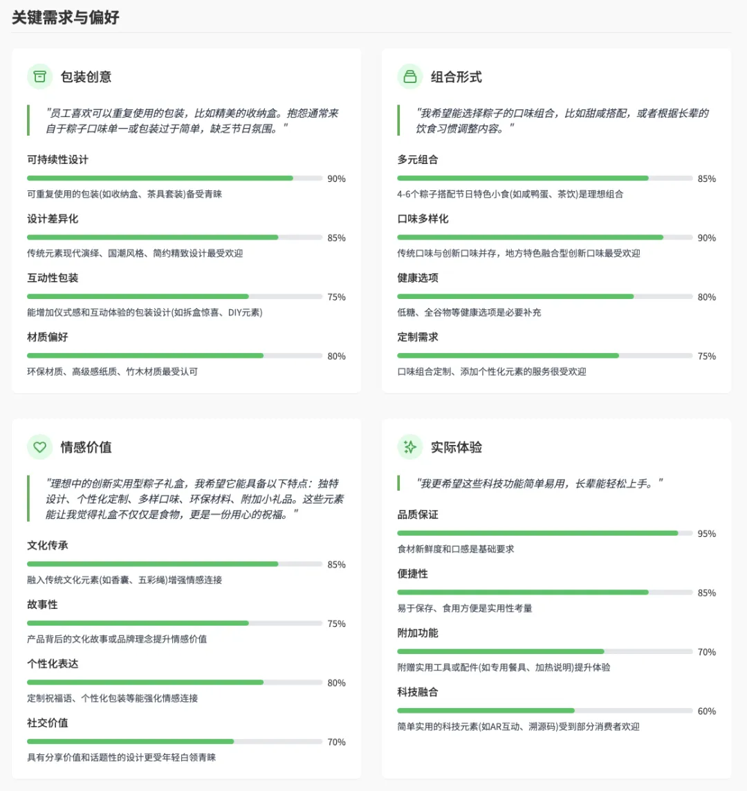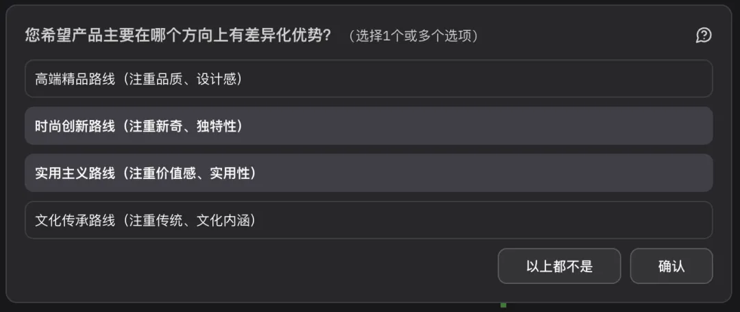 差异化优势方向:我们勾选了"时尚创新路线"与"实用主义路线"-我们期望粽子礼盒既能满足职场人群的送礼面子需求,又具备足够的实用价值,这两个方向的结合能帮助我们清晰了解用户的复合需求。