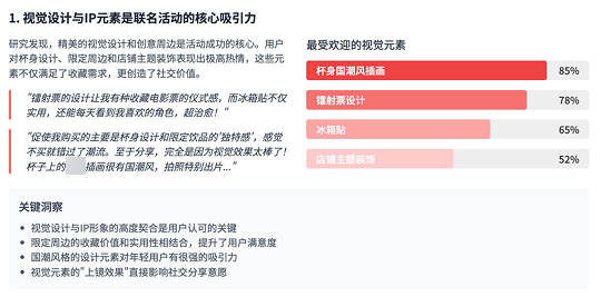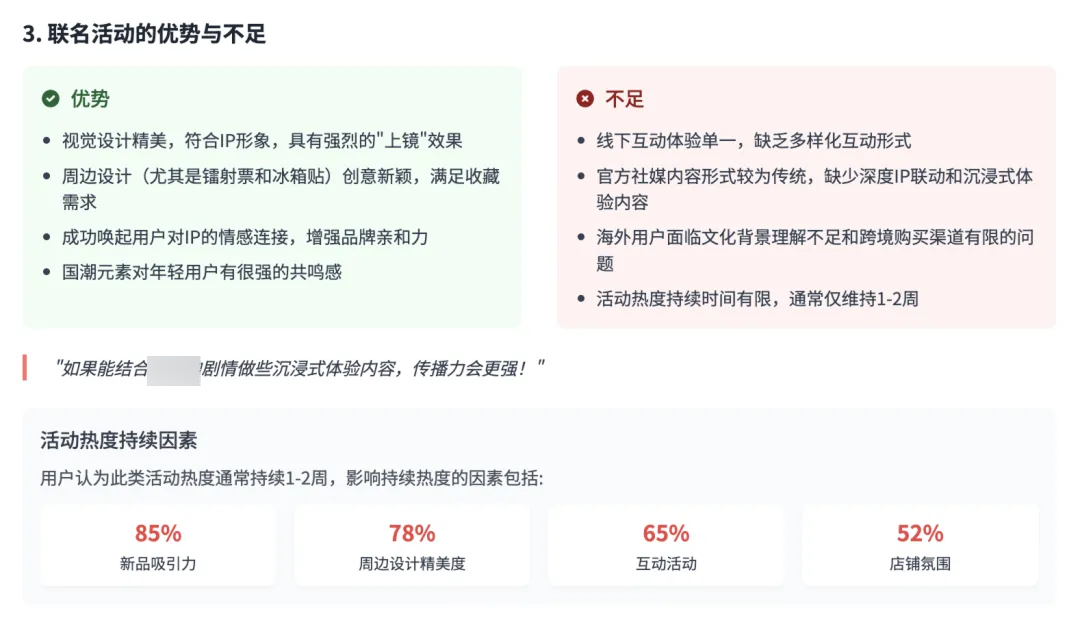 报告显示,本次联名活动整体用户反响热烈,在视觉设计与周边打造方面获得广泛好评,互动形式则较为单一难以满足用户多元参与需求。