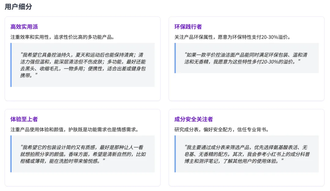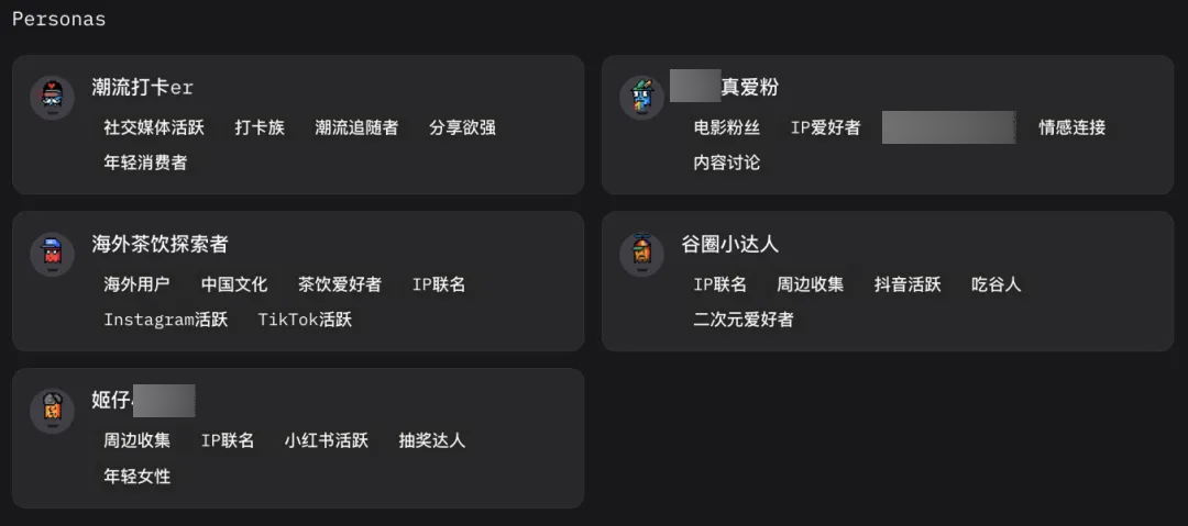 系统在整合完社交平台讨论后,会自动生成五个典型用户画像(Persona),每个角色都基于大量真实讨论,具备清晰的标签与行为特征。