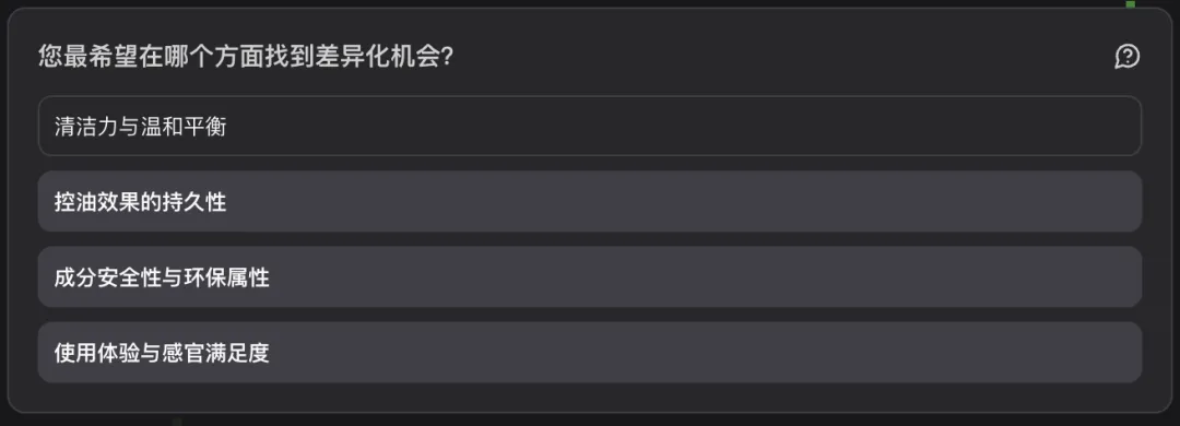 假设我是一家中小型护肤品牌的营销负责人,想要通过对市场上已有多款大牌控油洁面产品的用户自然讨论进行深入分析。在初始输入中只描述了产品方向与目标,但系统在实际执行前主动补充询问了三个关键问题:目标消费人群、主要关注的竞品价格层、希望找到的差异化维度。