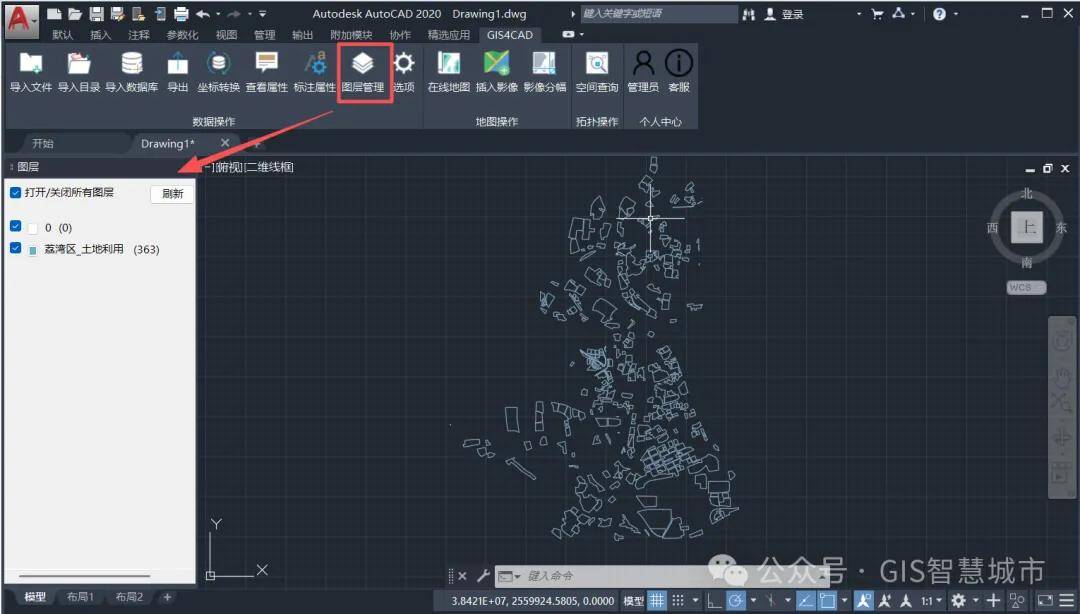 2.在GIS4CAD菜单上,打开“图层管理”面板;