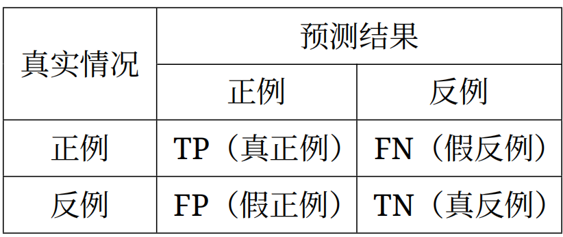 二分类问题的查准率与查全率:将二分类的样本分为正例和反例两类,预测值和真实值的组合有四种情况,形成混淆矩阵: