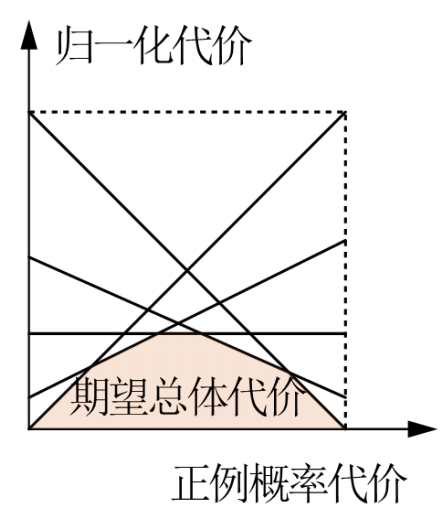 这些线段的包络线称为代价曲线,代价曲线下方的面积为期望总体代价,面积越小学习器越好。