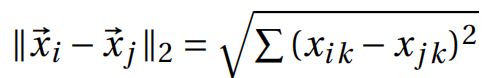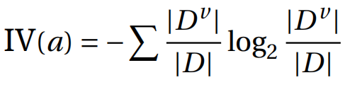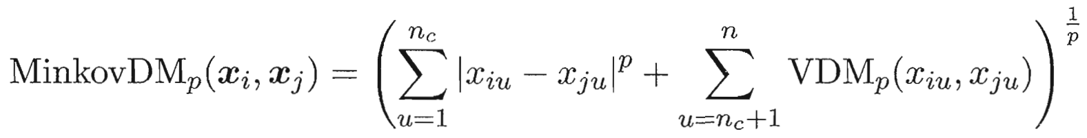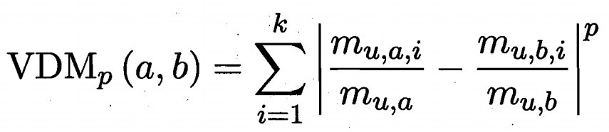 表示第i个簇中,属性u上取值为a的样本数,记总簇数为k,则属性u上两个离散值a与b之间的VDM距离为: