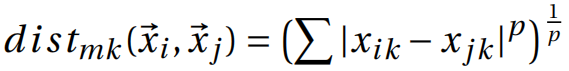 对于两个n维向量,闵可夫斯基距离定义为: