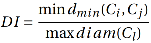 Dunn指数:用各对簇的簇间距离最小值,除以簇内距离的最大值,越大越好: