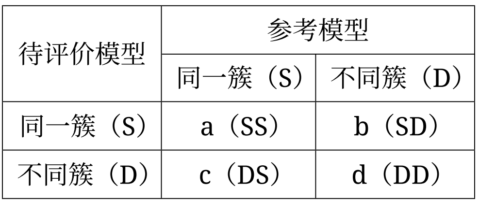 从m个样本中任选出两个样本S、D,参考模型和待评价模型得出的结果可形成如下列联表: