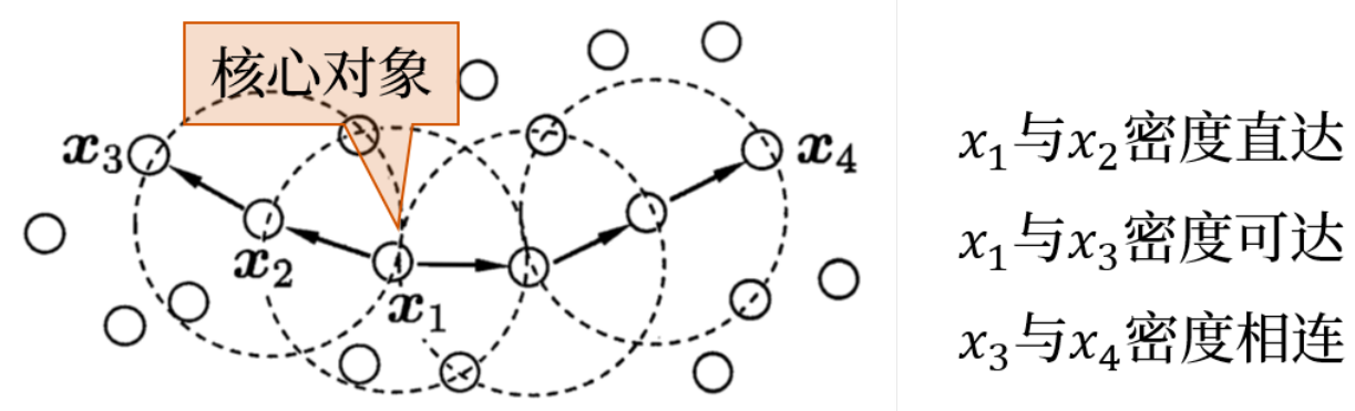 密度可达:两个样本以若干样本作为媒介密度直达,不满足对称性(边界对象)。