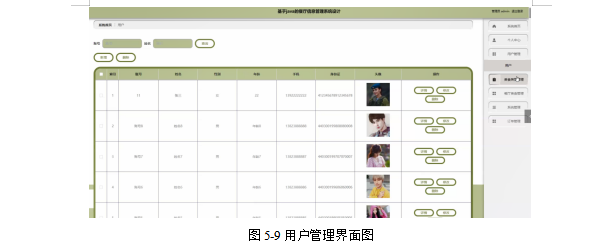 管理员点击用户管理,在用户管理页面的输入账号、姓名、性别、年龄、手机、身份证、头像等内容,进行查询、新增或者删除用户信息等操作,如图5-9所示。
