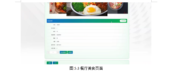 用户点击餐厅美食,在餐厅美食页面的搜索栏输入菜品名称、餐厅名称、价格等信息,进行查询,然后还可以查看菜品名称、美食类型、封面、荤素、分量、餐厅名称、单限、库存、价格等信息,然后可以进行添加到购物车、立即购买或者收藏等操作;如图5-3所示: