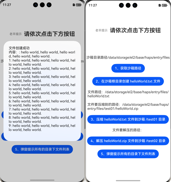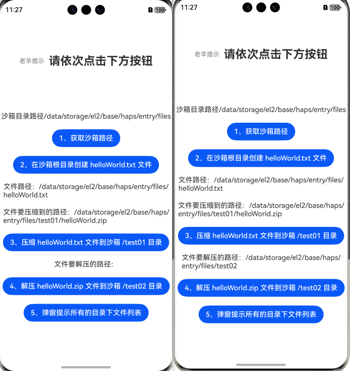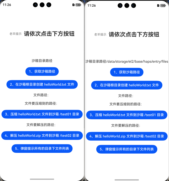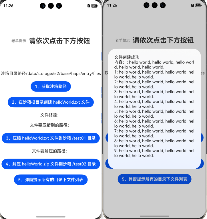struct Index {@Local decompressFile: string = ""@Local inFile: string = ""@Local outFile: string = ""@Local filesDir: string = ""context = this.getUIContext().getHostContext()!build() {Column({ space: 100 }) {Row({ space: 10 }) {Text("老羊提示").fontSize(14).fontColor(Color.Gray)Text("请依次点击下方按钮").fontSize(26).fontWeight(FontWeight.Bold)}Column({ space: 20 }) {Text("沙箱目录路径" + this.filesDir)Button("1、获取沙箱路径").onClick(() => {this.getSandboxPath()})Button("2、在沙箱根目录创建 helloWorld.txt 文件").onClick(() => {this.createHelloWorldTxtInSandboxRoot()})Text("文件路径:" + this.inFile)Text("文件要压缩到的路径:" + this.outFile)Button("3、压缩 helloWorld.txt 文件到沙箱 /test01 目录").onClick(() => {this.compressHelloWorldTxtToSandboxTest01Dir()})Text("文件要解压的路径:" + this.decompressFile)Button("4、解压 helloWorld.zip 文件到沙箱 /test02 目录").onClick(() => {this.decompressHelloWorldZipToSandboxTest02Dir()})Button("5、弹窗提示所有的目录下文件列表").onClick(() => {this.showAllDirectoryFilesListInDialog()})}}.width("100%").height("100%").justifyContent(FlexAlign.Center)}showDialog(mes: string) {this.getUIContext().showAlertDialog({ message: mes })}showAllDirectoryFilesListInDialog() {try {const fileList01 = fs.listFileSync(this.filesDir)const fileList02 = fs.listFileSync(this.filesDir + '/test01/')const fileList03 = fs.listFileSync(this.filesDir + '/test02/')const list =["___沙箱总目录___", ...fileList01, "___test01目录___", ...fileList02, "___test02目录___", ...fileList03]this.showDialog(list.join('\n'))} catch (err) {this.showDialog(JSON.stringify(err))}}decompressHelloWorldZipToSandboxTest02Dir() {// 创建目录try {fs.mkdirSync(this.filesDir + "/test02")} catch (err) {console.error('文件夹已存在');}this.decompressFile = this.filesDir + '/test02';let options: zlib.Options = {};zlib.decompressFile(this.outFile, this.decompressFile, options).then((data: void) => {// 检查解压后的文件是否存在(这里假设解压后是data.txt)try {const stat = fs.statSync(this.decompressFile + '/test02/helloWorld.txt');console.info(`解压成功,文件大小: ${stat.size} 字节`);} catch (err) {console.error('解压文件生成失败');}console.info('decompressFile success, data: ' + JSON.stringify(data));}).catch((errData: BusinessError) => {console.error(`decompressFile errCode: ${errData.code}, message: ${errData.message}`);})}compressHelloWorldTxtToSandboxTest01Dir() {this.inFile = this.filesDir + '/helloWorld.txt';this.outFile = this.filesDir + '/test01/helloWorld.zip';try {// 创建目录fs.mkdirSync(this.filesDir + "/test01")} catch (err) {console.error('文件夹已存在');}// 压缩文件let options: zlib.Options = {};zlib.compressFile(this.inFile, this.outFile, options).then((data: void) => {// 检查压缩文件是否存在try {const stat = fs.statSync(this.outFile);console.info(`压缩成功,文件大小: ${stat.size} 字节`);} catch (err) {console.error('压缩文件生成失败');}console.info('compressFile success, data: ' + JSON.stringify(data));}).catch((errData: BusinessError) => {console.error(`compressFile errCode: ${errData.code}, message: ${errData.message}`);})}createHelloWorldTxtInSandboxRoot() {// 创建文件 helloWorld.txtlet inFile = fs.openSync(this.filesDir + '/helloWorld.txt', fs.OpenMode.READ_WRITE | fs.OpenMode.CREATE);// 写入测试数据for (let index = 0; index < 10; index++) {fs.writeSync(inFile.fd, index + ': hello world, hello world, hello world, hello world, hello world.\n');}// 关闭文件fs.closeSync(inFile);// 读取文本内容let readTextOptions: ReadTextOptions = {offset: 1,length: 0,encoding: 'utf-8'};let stat = fs.statSync(this.filesDir + '/helloWorld.txt');readTextOptions.length = stat.size;let str = fs.readTextSync(this.filesDir + '/helloWorld.txt', readTextOptions);this.showDialog(`文件创建成功\n内容:${str}`)}getSandboxPath() {this.filesDir = this.context.filesDir}