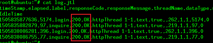 3、查看log.jtl,返回200,说明运行成功(可以将log.jtl发送到windows下查看:添加聚合报告,在聚合报告中打开该文件)