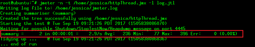 2、输入命令:# jmeter -n -t /home/jessica/httpThread.jmx -l log.jtl,查看结果