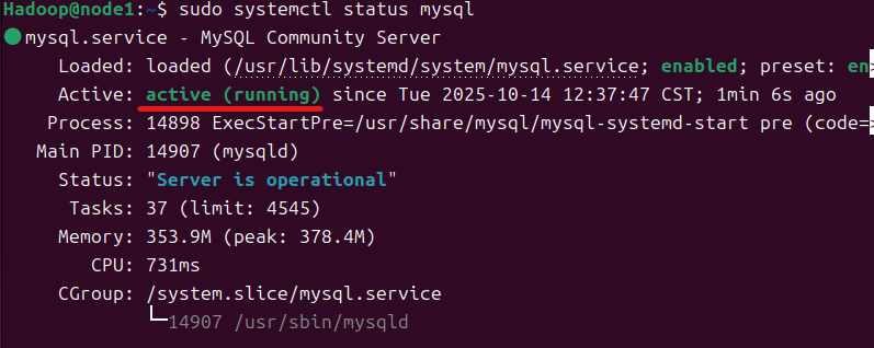 ②安装完成后,MySQL 服务会自动启动,可通过以下命令检查状态: