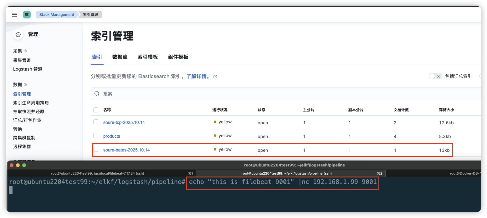 root@ubuntu2204test99:~/elkf/logstash/pipeline# echo "this is filebeat 9001" |nc 192.168.1.99 9001
