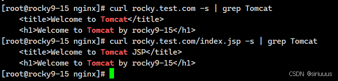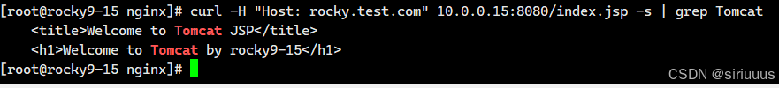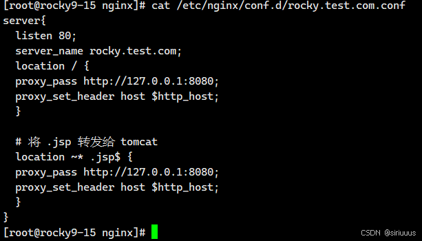 server{listen 80;server_name rocky.test.com;location / {proxy_pass http://127.0.0.1:8080;proxy_set_header host $http_host;}# 将 .jsp 转发给 tomcatlocation ~* .jsp$ {proxy_pass http://127.0.0.1:8080;proxy_set_header host $http_host;}